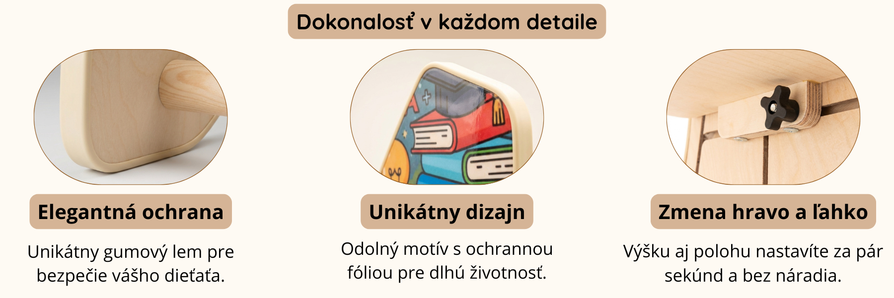Bezpečie a komfort (Gumený lem): Ako jedni z mála opatrujeme hrany bočníc bezpečnostným gumeným lemom. Ten je oveľa príjemnejší na dotyk než holé drevo, nechladí, tlmí nárazy a chráni tak vaše dieťa, ako aj samotnú stoličku a podlahu pred poškriabaním.