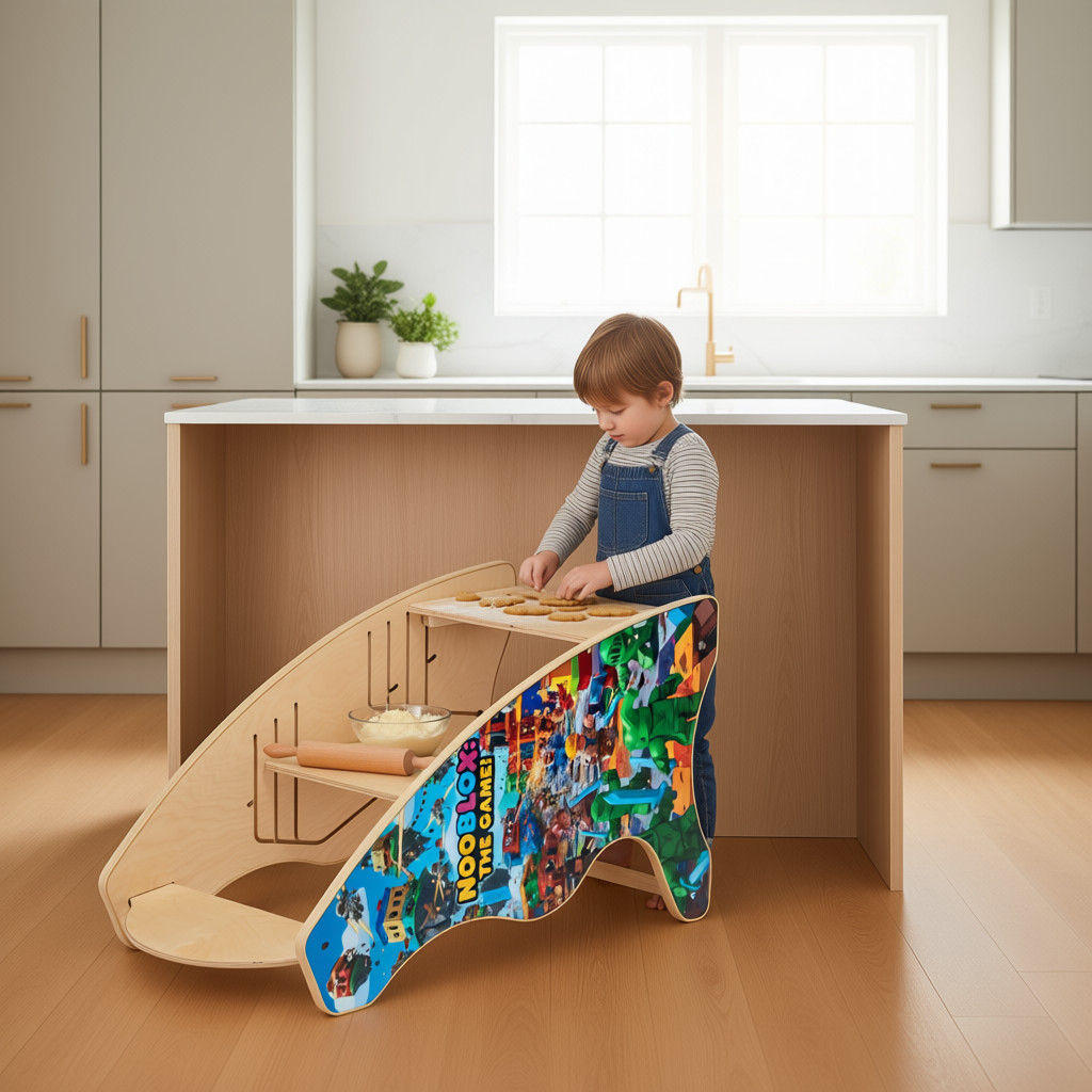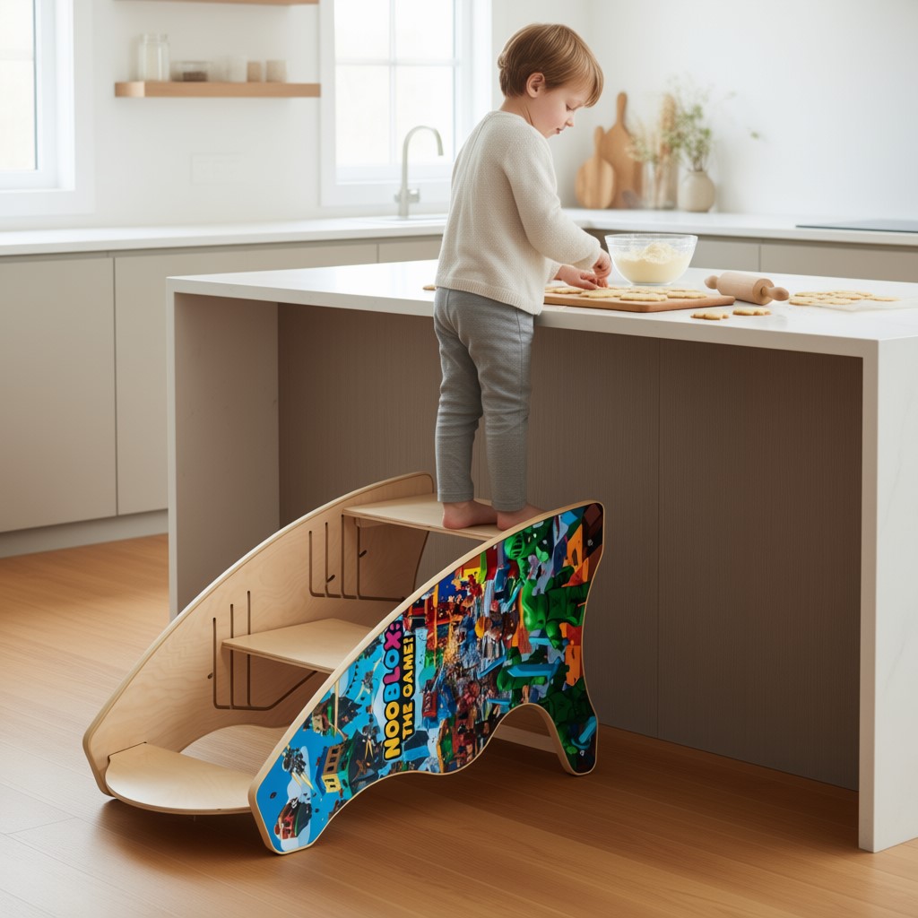 2. Schůdky: Praktický přístup k kuchyňské lince. Umožňuje malým pomocníkům bezpečně asistovat při vaření a zapojit se do chodu domácnosti v úrovni očí dospělých.